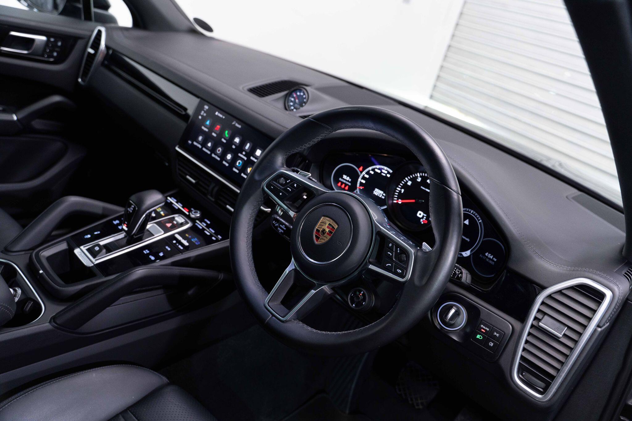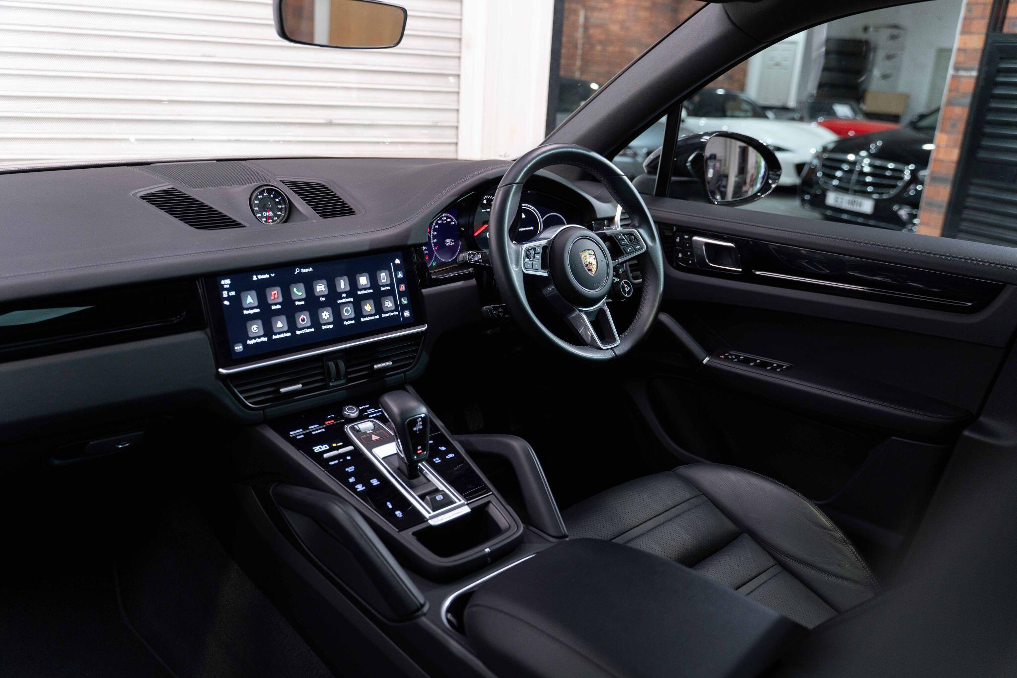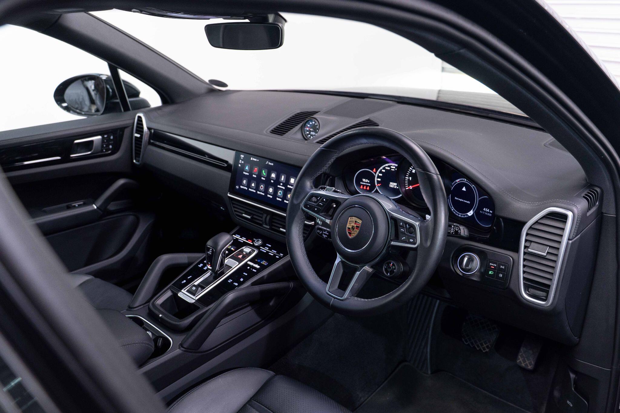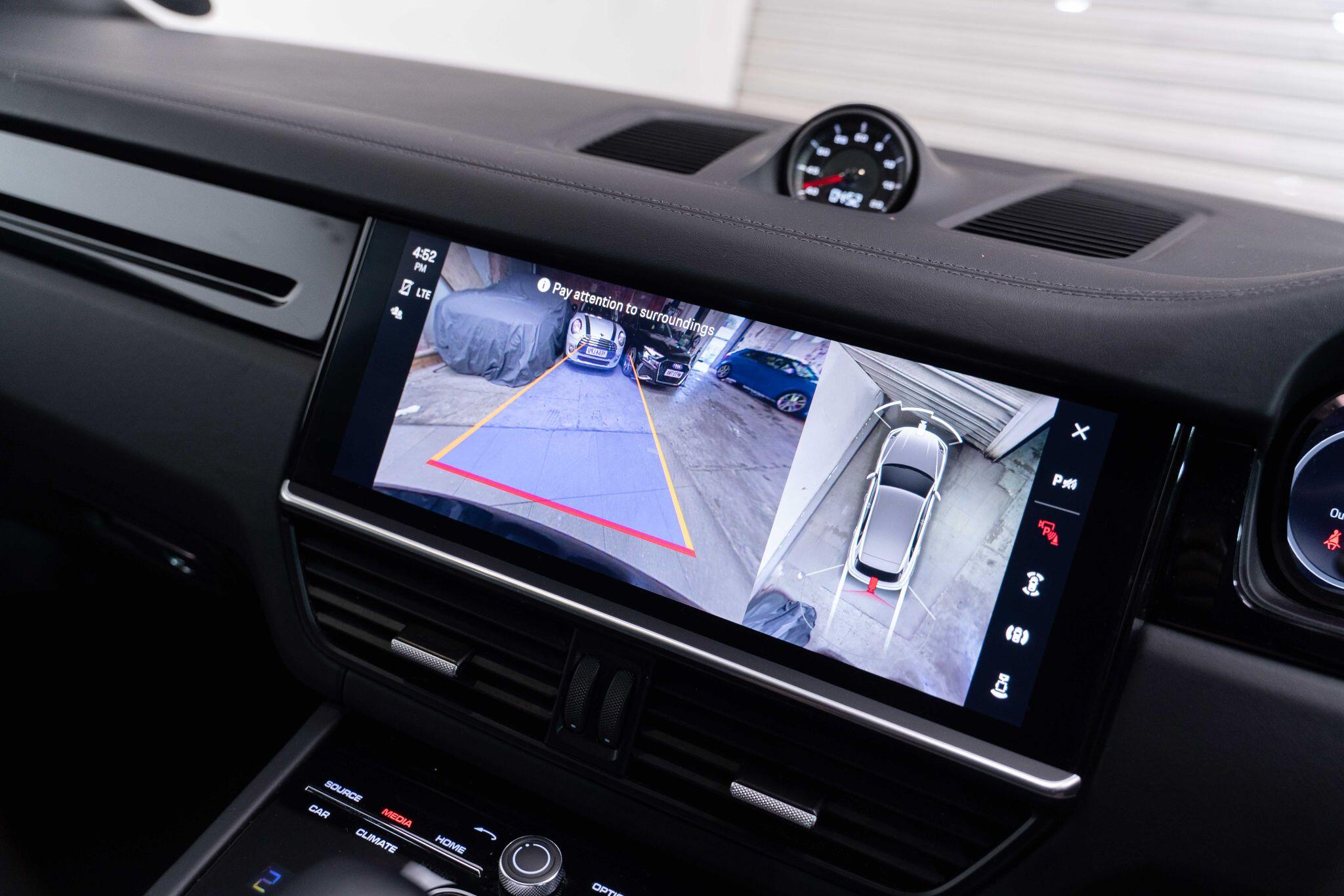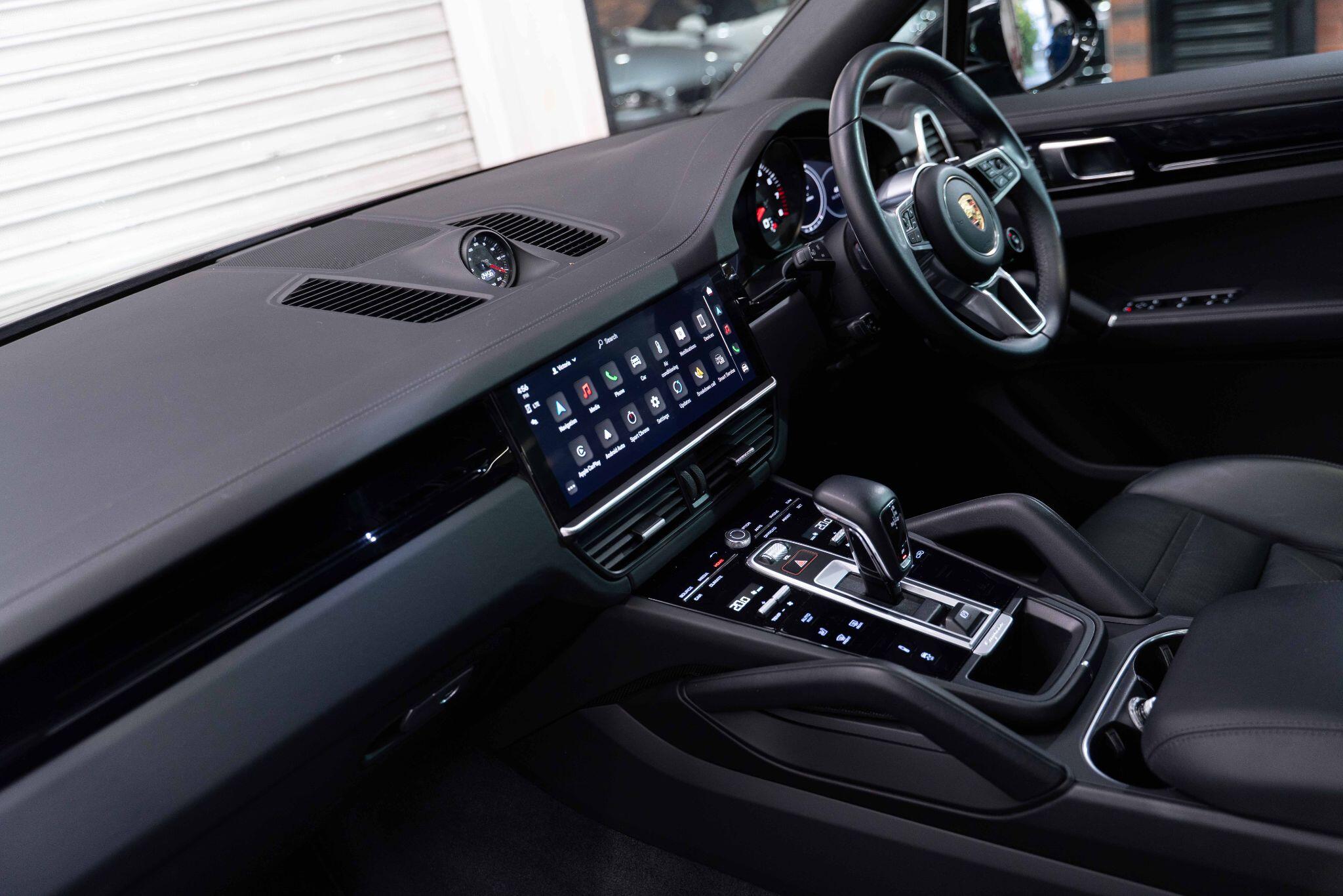 This 2022 Porsche Cayenne T V6 offers a compelling blend of performance and practicality, boasting a 3.0L petrol engine and four wheel drive for assured handling in all conditions. Finished in a sophisticated black, with the PORSCHE logo and model designation painted in black matt and high gloss black respectively, it presents a striking aesthetic. This Euro 6 compliant model is equipped with a host of desirable features, including ParkAssist with a 360 degree camera for effortless manoeuvring, an electrically extending towbar system for added versatility, and black aluminium roof rails.