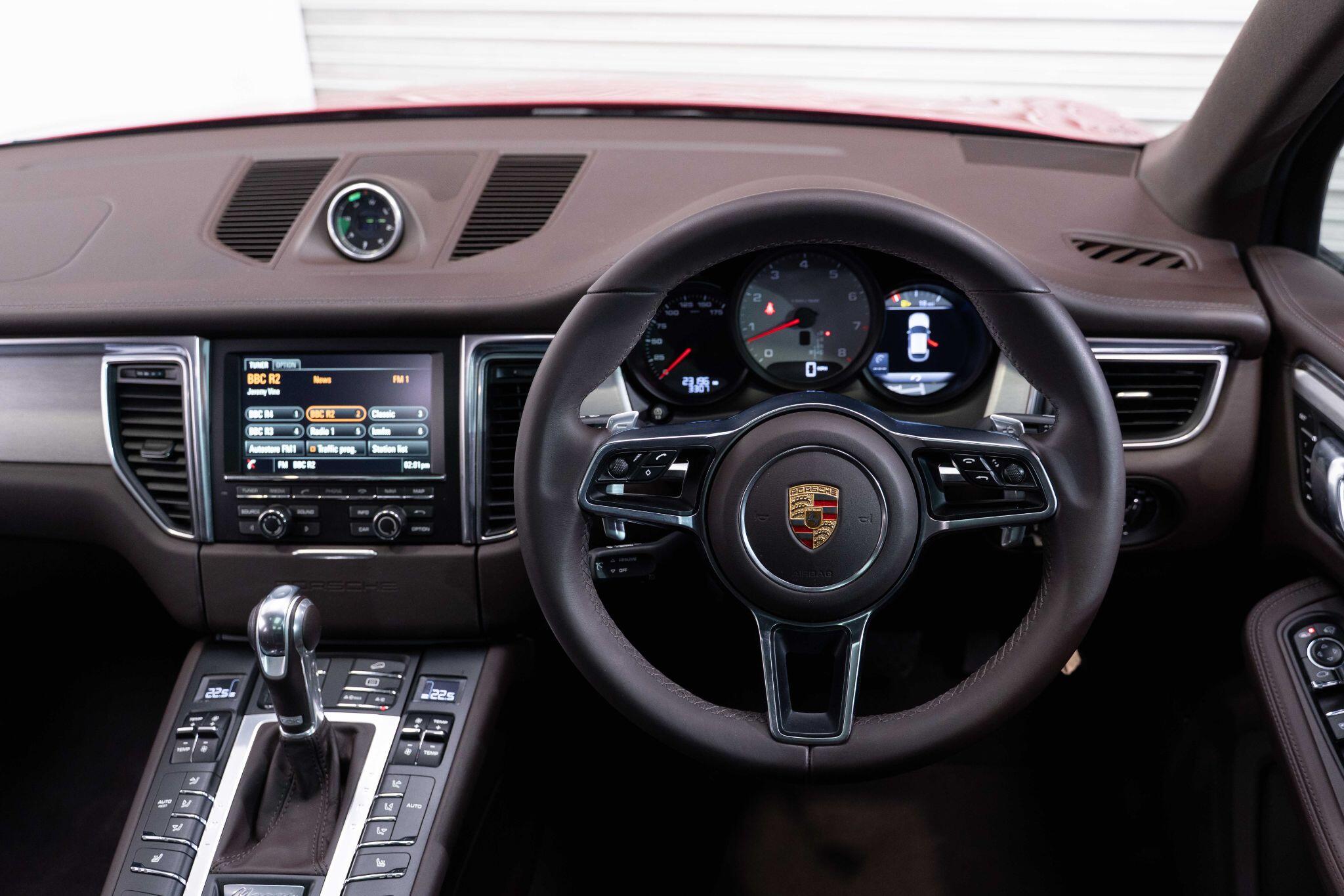 This 2015 Porsche Macan V6 S presents an exceptional ownership proposition, having been meticulously maintained by a single owner from new and boasting a remarkably low mileage of just 23,000 miles. Under the bonnet lies a potent 3.0 litre petrol engine, paired with a four wheel drive system for assured performance in all conditions. This Euro 6 compliant Macan is equipped with Bi-Xenon headlights featuring Porsche Dynamic Light System (PDLS), a Sport Chrono Package for enhanced driving dynamics, and stylish 20 inch RS Spyder Design alloy wheels. Inside, you will find a heated multifunction steering wheel crafted from Dark Burr Walnut, adding a touch of refined luxury.